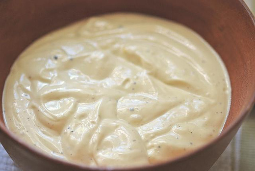 Stop pouring, but continue beating every 10 seconds or so to be sure the yolks are absorbing the oil. After 1/3 – 2/3 cup of oil has been incorporated the sauce should thicken into a very heavy cream.